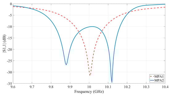 The reflection coefficient bandwidth extends from 9.736 GHz to 10.268 GHz, which is equal to a 5.32% FBW. The reflection coefficient curve shows two resonances at 9.808 GHz and 10.180 GHz and, despite a slightly worse matching at center frequency, the overall bandwidth is broadened with respect to the case of MPA1 by a factor of 3.35. A third resonance can be observed, although not visible in Figure 8 being outside the frequency range of interest. Nevertheless, the introduction of a third resonator is indeed functional to the bandwidth broadening at 10 GHz.