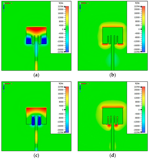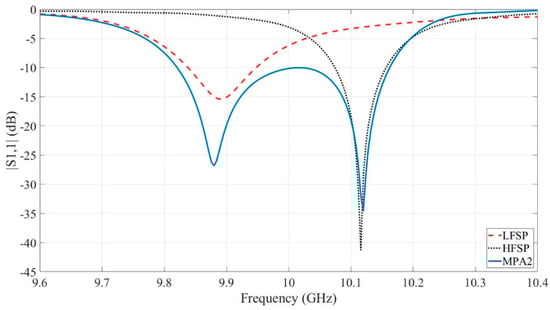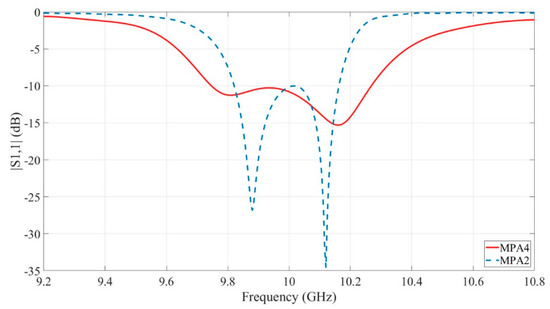 The low- and high-frequency sub-patches resonate at the same frequencies exhibited by MPA2, as clearly shown in Figure 5. These results prove that MPA2 is indeed the superposition of two independent patch antennas.