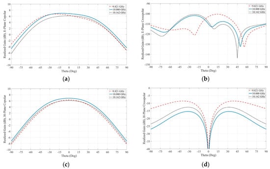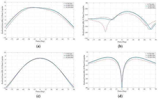 The E-plane and H-plane radiation patterns are reported in Figure 9 at 10 GHz and at the lower and higher frequencies of the 10-dB reflection coefficient bandwidth. The antenna radiates a linearly polarized electric field, again with the typical hemispherical distribution of microstrip patch antennas with stable performance and low cross-polarization.