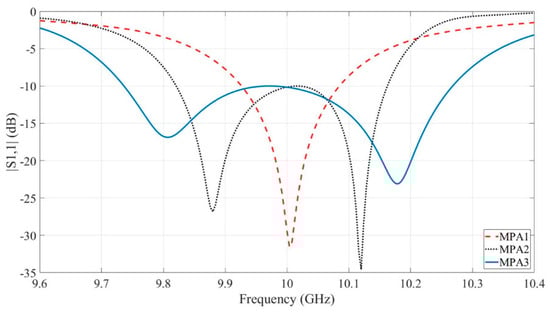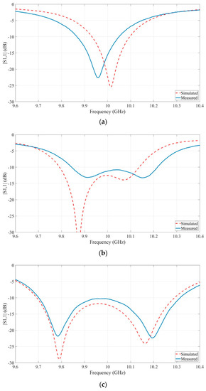 The three prototypes, shown in Figure 15, are tested with an Agilent N5230A vector network analyzer using the one-port short-open-load calibration technique. Measured results are compared with simulations and, despite minor frequency shifts caused by manufacturing tolerances, a very good agreement can be observed in Figure 16. The 10-dB measured reflection coefficient bandwidth for MPA1 extends from 9.867 GHz to 10.050 GHz, which is equal to a 1.84% FBW. The 10-dB measured reflection coefficient bandwidth for MPA2 extends from 9.844 GHz to 10.216 GHz, which is equal to a 3.71% FBW. The 10-dB measured reflection coefficient bandwidth for MPA3 extends from 9.702 GHz to 10.314 GHz, which is equal to a 6.12% FBW.