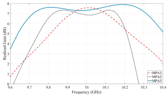 Realized gain vs. frequency for MPA1, MPA2, and MPA3.