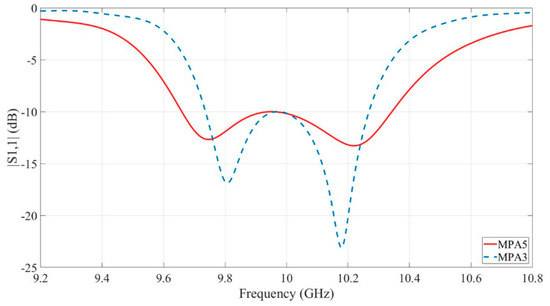 Simulated reflection coefficient characteristics for MPA4 and MPA5 are reported in Figure 11 and Figure 12 to show the bandwidth broadening caused by the reduced gap widths with respect to MPA2 and MPA3. The MPA4 reflection coefficient bandwidth extends from 9.747 GHz to 10.268 GHz, which is equal to a 5.21% FBW. The MPA5 reflection coefficient bandwidth extends from 9.656 GHz to 10.342 GHz, which is equal to a 6.86% FBW.