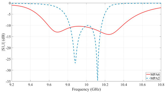 The 10-dB reflection coefficient bandwidth for MPA6 extends from 9.591 GHz to 10.388 GHz, which is equal to a 7.98% FBW. This means that the antenna bandwidth is increased by a factor of 2.16 with respect to MPA2 using a substrate of doubled thickness, as expected from microstrip antenna theory.