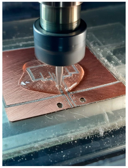 The three illustrated antennas are manufactured using a fast in-house prototyping process comprising a low-cost printed circuit board (PCB) milling machine and a traditional etching solution. The milling machine is controlled with computer-aided manufacturing (CAM) software. In order to guarantee high accuracy machining, a two-step calibration phase is required. The first step is the depth calibration of the milling tool, which is a V-shaped drill used as a conductive probe to sample the PCB in a number of points in order to obtain a numerical profile of the surface where the milling takes place. By doing so, it is possible to keep the milling tool at a constant depth along the vertical axis, drilling only the copper layer and leaving the substrate almost untouched. The second step is the groove width calibration, which consists in milling a test pattern of known dimensions. A microscope is used to measure the groove width and, if necessary, a correction of the CAM software parameters is applied to minimize the manufacturing errors. Machining is performed at low speed in order to have a clear cut on the copper layer. A cooling process must be adopted to dissipate the heat generated by the friction of the milling tool during the drilling process. To this purpose, a thin layer of water is used to cool the drill and mitigate any thermal deformation, as shown in Figure 14. In this way, an almost constant groove width can be guaranteed with a tolerance of ±10 µm. In addition to this, the water layer avoids the dispersion of thin particles in the air. In order to minimize the machined surface area and to speed up the entire manufacturing process, the antenna pattern is contoured with a milled groove of 1–1.5 mm, then protected with a thin layer of nail varnish and finally etched using a ferric chloride solution to remove the remaining copper.