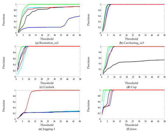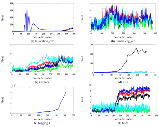 The precision plots are shown in Figure 3. These plots provide frame-by-frame precision in entire image sequences. Since precision gives the mean value of an entire image sequence, it is a possibility that the tracker might get drift for a few frames but then again tracks the target correctly. Therefore, these plots were presented to show the efficacy of the tracking method. Various challenges were present in sequences such as occlusion, illumination variations, background clutter, etc. In sequences (Carchasing_ce3, Cardark, Cup, Jogging-1, Juice, Man, and Plate_ce2), the proposed tracker has the highest precision in the entire sequence. In sequence Busstation_ce2, the proposed tracker has slightly lower precision.
