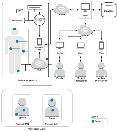 With regard to the physiological parameters, there is a need for a set of different sensors. Therefore, a BAN (i.e., the SmartWalk BAN) was implemented to aggregate this set of sensors together with the capability to either analyze or communicate the data produced by them.