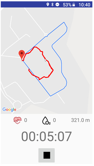 A smartphone application (i.e., the SmartWalk App) was developed for older adults’ interactions that allowed users to see the planned routes and the actual routes walked, respectively presented in blue and red in Figure 2. The users could also access complementary information, such as their heart rates, blood oxygen levels, distances walked and how long they had been walking.