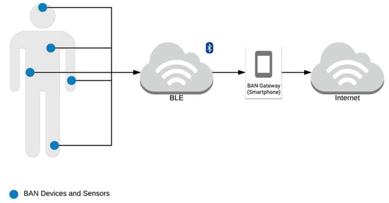 - O’Donovan, T.; O’Donoghue, J.; Sreenan, C.; Sammon, D.; O’Reilly, P.; O’Connor, K.A. A context aware wireless body area network (BAN). In Proceedings of the 2009 3rd International Conference on Pervasive Computing Technologies for Healthcare, London, UK, 1–3 April 2009; pp. 1–8. [Google Scholar]