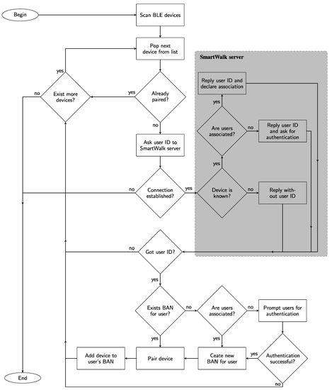For the SmartWalk App to be associated with a specific BAN, it must identify the respective BLE device. To do that, the application checks for devices and if it finds one or more new devices, it questions the SmartWalk Server whether the devices that were identified are already associated with the current users. If the answer is positive, the SmartWalk App seamlessly maps the devices to the users’ BANs, if they are already active, or creates new pairs composed of the BANs and the respective BLE devices (Figure 4).