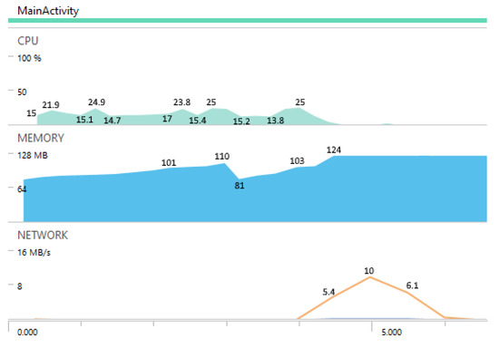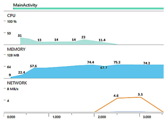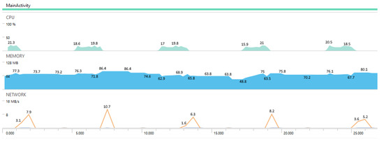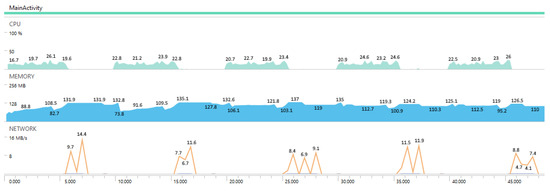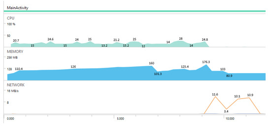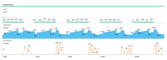 Figure 6, Figure 7, Figure 8, Figure 9, Figure 10 and Figure 11 show the testing smartphone’s usage of its Central Processing Unit (CPU), memory, and network bandwidth as each test was performed in order to ascertain performance, displaying the various values over time. Figure 6, Figure 7 and Figure 8 show the data for single file uploads of 2.5, 7.5, and 15 MB, respectively, and Figure 9, Figure 10 and Figure 11 show five consecutive file uploads of 2.5, 7.5, and 15 MB, respectively. In each figure, it can be seen that CPU usage spiked at the beginning as the files were encrypted, and then dropped as the file was being sent. It can also be observed, for multiple files, that memory usage increased during the entire process of file uploading and then dropped off, before increasing again when the next file started to be uploaded.
