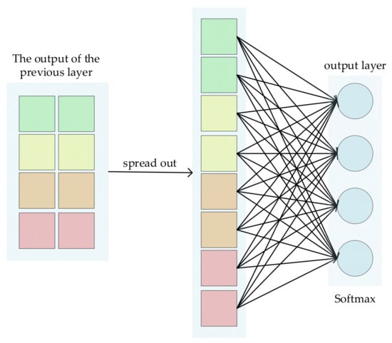 The full connection layer classifies the features that are extracted by the convolution kernel. To be specific, the output of the previous layer is first spread out as a one-dimensional vector (as shown in Figure 1), which is used as the input of the full connection layer, and the input and output are fully connected. The formula for the full connection layer is shown as
