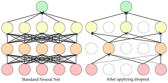 The dropout proposed by Hinton et al. [32] reduces the overfitting and enhances the generalization ability of a neural network. The dropout algorithm sets the neurons in a certain layer of the neural network to zero at a certain probability p, as shown in Figure 2. The algorithm weakens the joint adaptability of the same layer of neural nodes and improves the generalization ability. A neural network with N nodes is regarded as a set of models while using the Dropout algorithm. The number of training parameters is unchanged, and the optimal model is selected from the models as the best model by training.