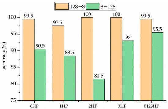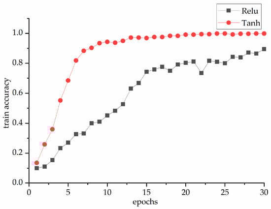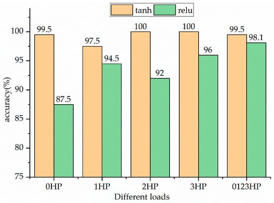 In Figure 7, the loss curve can be seen in the process of 30 finite iterations, despite the fact that the loss function values of both are constantly decreasing. However, if the activation function is Tanh, then the curve converges at a significantly faster rate and, finally, approaches zero value. In contrast, if the activation function is Relu, then the convergence becomes slower. The accuracy curve depicted in Figure 8 shows that, with the increase of iteration times, the activation function uses Tanh in order to converge faster and more accurately than Relu. In order to further prove the necessity of selecting Tanh as the activation function, experiments were carried out at 0 HP, 1 HP, 2 HP, 3 HP, and 0123 HP. The experimental results that are shown in Figure 9 indicate that Tanh is more accurate than Relu if the former is selected as the activation function for the 1D-CNN network model proposed in this paper. According to the corresponding experimental results, Relu was deemed to be unsuitable for the 1D-CNN model that was proposed in this paper.
