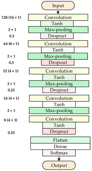 In each convolution layer, the appropriate number and size of the convolution kernel performs one dimensional convolution operations. The input data are the one-dimensional signal that has a length of 1024. Five convolution layers use 128 convolution kernels of size 16 × 1 (Conv1), to Conv5), 64 of size 8 × 1 (Conv2), 32 of size 4 × 1 layer (Conv3), 16 of size 4 × 1 (Conv4), and eight of size 4 × 1 (Conv5). Tanh is the hyperbolic activation function for the five convolution layers.