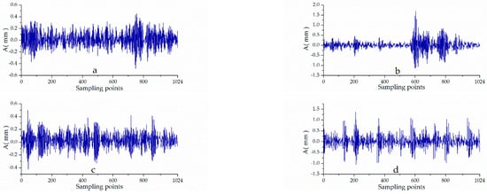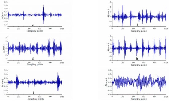 In the experiment, the vibration data from the acceleration sensor at the driving end were selected at 12 kHz sampling frequency. The data set included nine types of failures in the normal state of the bearing, the bearing inner ring, and the ball bearings at diameters of 0.0028 mm, 0.0056 mm, and 0.0083 mm. The damage points of the bearing’s outer ring were in the direction of3, 6, and 12 o’clock. The vibration signals of the 10 fault types were selected when the load was 0 HP, 1 HP, 2 HP and 3HP with 1024 data points (the motor speed is 1797/min. At the sampling frequency of 12 kHz, there are 60/1797 × 12000 = 400.67 sampling points in each cycle. The sample length is set to 1024, which can contain sample data of 1024/400 = 2.56 cycles, so as to ensure that each sample contains abundant fault feature information). Different fault types under different loads are divided into the training set, validation set, and test set according to the ratio of 6:2:2. Table 1 shows the data set of rolling bearing vibration signals. Figure 6 reveals the original vibration signals of the 10 fault types under 0 HP.
