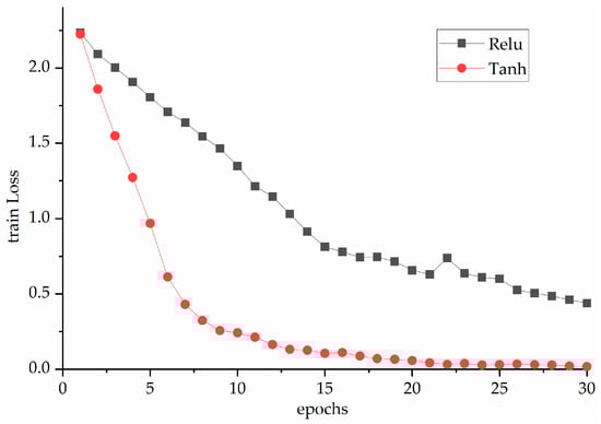 The neural network is a multilayer compound function in mathematics. If there is no activation function, then the neural network will be a linear function. However, samples are not always linearly separable, so the activation function with nonlinear factors, such as Tanh and Relu, should be used in order to solve problems that cannot be settled. Relu makes the output of neurons with a negative input value zero, which reduces the interdependence among parameters and speeds up the calculation. In order to explore the influence of Tanh and Relu on the 1D-CNN network, their activation functions are used in the experiment under the load of 0HP. Figure 7 and Figure 8 show the curve of loss function and accuracy in the training process.