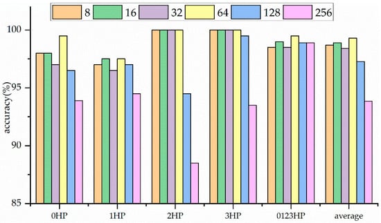 When training the network model, a batch size impacts not only the training speed, but also the accuracy. A large batch-size can expedite the training process, but it requires a large memory space in a computer. For small batch-size in the training process, although the operation speed is slower and some noise is produced, the appearance of noise is also helpful in preventing the training process from falling into local optimal. Therefore, it is very important to select an appropriate batch-size. In this paper, six different batch-sizes (8, 16, 32, 64, 128 and 256) were selected for comparison test under different loads. The experimental results, as shown in Figure 10, indicate that, when the batch-size is 8, 16, 32 and 64, the average accuracy of the 1D-CNN model on different loads reaches more than 98%, while the batch size is 128, 256, the average accuracy of different loads reads 97.28% and 93.86%, respectively. The experimental results show that the 1D-CNN model has the highest average accuracy of 99.3% under different loads when the batch size is 64.