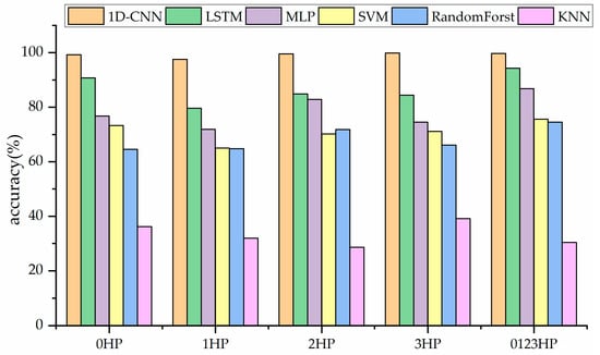 The 1D-CNN model is compared with the experiments of five different models that are based on machine learning and deep learning, so as to prove the effectiveness of the 1D-CNN model in the fault diagnosis of rolling bearings. The five models are LSTM (Long-Short Term Memory), MLP, SVM, Random forest, and KNN. The datasets shown in Table 1 were used by the six models. The specific parameters of LSTM and MLP network models are selected after experiments are done with the same selection method as the parameters of 1D-CNN. GridSearchCV (10-fold cross verification parameters) is used in order to select several parameters that affect the performance of SVM, RandomForest, and KNN models. Experiments were carried out under loads of 0 HP, 1 HP, 2 HP, 3 HP, and 0123 HP (represents a new bearing vibration data set that is composed of bearing vibration data sets with loads of 0 HP, 1 HP, 2 HP, and 3 HP). The parameters of each model are as follows: