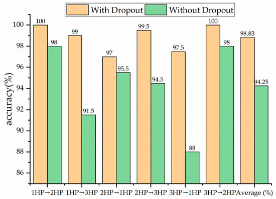 Cross-load training was carried out under the three loads of 1 HP, 2 HP, and 3 HP, as shown in Figure 12. The experimental results show that the generalization ability of the 1D-CNN network model is significantly improved with the addition of Dropout layer; especially, the model accuracy is increased by 9.5% under the condition of 3 HP→1 HP. The average accuracy of cross-load training increased from 94.25% (without Dropout) to 98.83% (with Dropout) (“3 HP→1 HP” means training at 3 HP and testing at 1 HP).