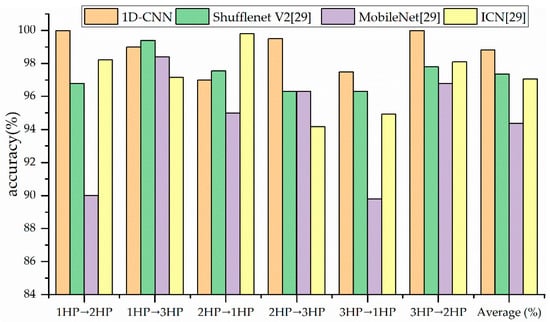 In the practical application, the fault samples of equipment under various loads are difficult to collect. Thus, the faults of rolling bearings are collected under a certain load. However, training the model for diagnosing the faults requires the fault data under different loads. In the research of this paper, the generalization ability of the 1D-CNN under different loads was investigated and the result was compared to that of Shufflenet V2, MobileNet, ICN [34], DFCNN [35], and PFC-CNN [36]. Table 5 and Figure 13 show the specific experimental contrast results (“1 HP→2 HP” means using 1HP as a training set and 2 HP as a test set).