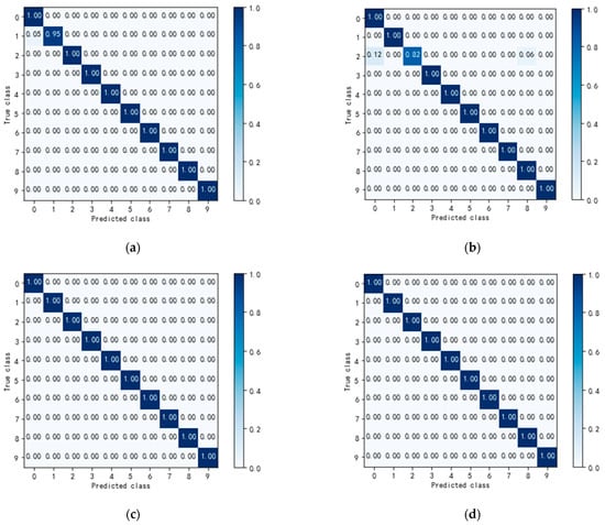 Confusion matrix under different loads (a) 0 HP, (b) 1 HP, (c) 2 HP, and (d) 3 HP.