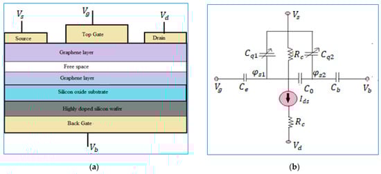 Configuration of a dual-gate graphene field effect transistor. (a) The 3D structure of the transistor. (b) Electrical equivalent circuit.