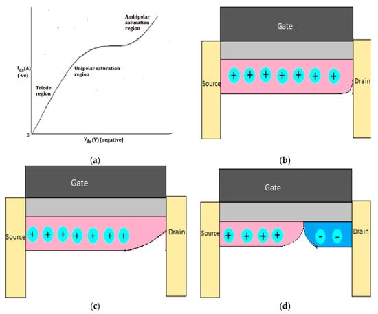 From Figure 3b,c, it can be understood that triode and unipolar saturation regions exhibit unipolar charge carrier and that is by holes. Afterwards, an ambipolar region is introduced, where carrier transportation is both by holes and electrons. Further increase in drain-to-source voltage pushes the minimum carrier density point at the pinch-off region toward the inside, i.e., this squeezed portion comes close to the source end. In this way, electrons get scope to enter into the channel, as indicated in Figure 3d. Therefore, this region becomes a complete package of holes and electrons running from source and drain terminals, respectively. For the mobility of the electrons there is no drained region between pinch-off and drain terminal. This phenomenon ultimately reaches to a concept that explains the zero bandgap theory in two-dimensional bilayer graphene. The voltage and charge accumulated at the drain terminal is and , respectively. Additional charge that is introduced can be formulated as where and is the mobility of the opposite charge carriers. We can derive by applying integration on using []. As a result, the saturation displacement current is obtained