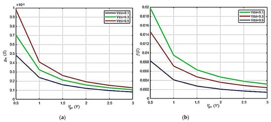 The output conductance is the change in the drain current with a small change in the gate source voltage while maintaining the drain source voltage constant. In Figure 6a, is shown for a range of with = 40 V. Length and width of graphene channel was taken as 440 nm and 1 µm, respectively. Here, were considered. It is interesting to notice that output characteristics displayed a linear region for low voltage bias and a saturation region for high voltage bias. The dropped substantially at large biasing voltage, mainly due to the effect of . As per the equation presented in Section 2.3, there is an inverse relationship between transconductance and gate source voltage. Therefore, the best performance was actually achieved at low effective gate-to-source overdrive voltage , where . The Figure 6b shows the estimation of transit frequency at which the current gain of the device drops to one, and it is a measure of its high-speed and bandwidth capabilities. Here,