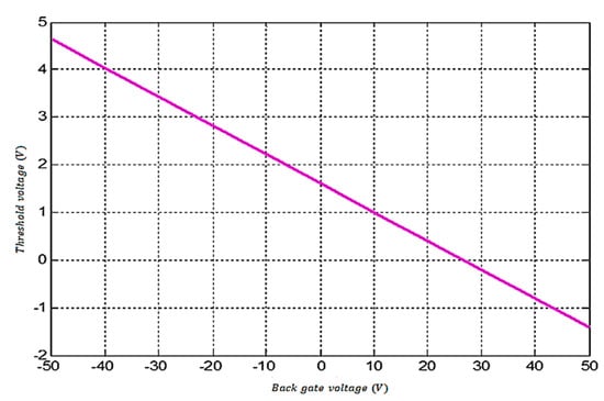 In the case of the plot, as shown in Figure 7, was used as dielectric. For a given back gate voltage (), the threshold voltage (was dependent on the device capacitances. Model parameters used are estimated in Table 1. For the test case shown in Figure 6, a good fit against experimental data was attained with top gate capacitance and back gate capacitance , respectively. It was reported that the threshold voltage against was a straight line graph with the slope being the ratio of the gate capacitances, as illustrated in Section 2.