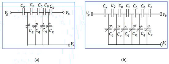 Compared to single-layer structure in bilayer GFET, there is an interlayer capacitance between two quantum capacitances, as shown in Figure 2a,b.
