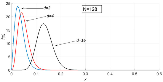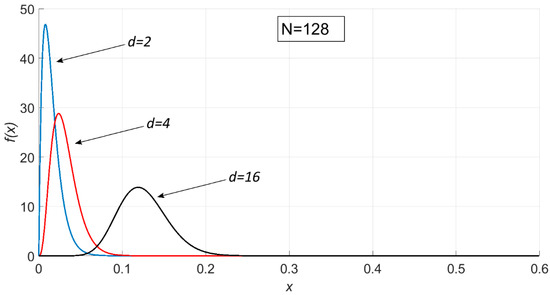 Probability density plot for , where N = 128, , and d = 2, 4, and 16.