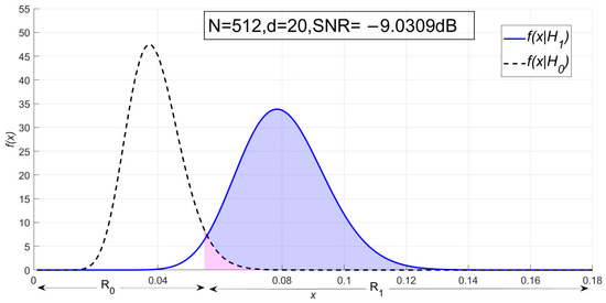 In Figure 3, and the SNR is −9.03 dB. The dotted line is the probability density function under H0, and the solid line is the probability density function under H1. R0 is the decision domain of signal absence, the range of which is . R1 is the decision domain of signal presence, the range of which is .
