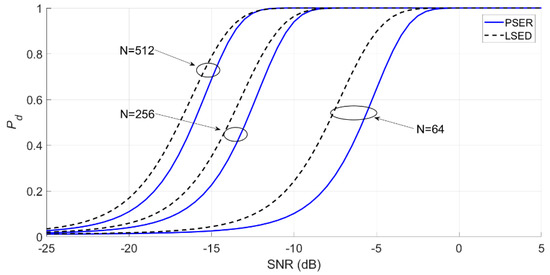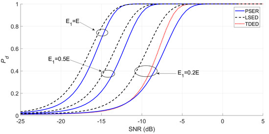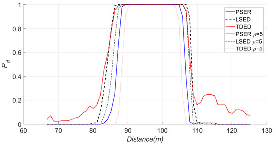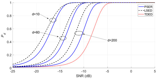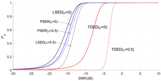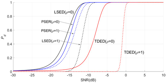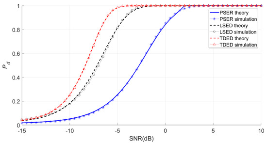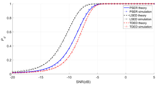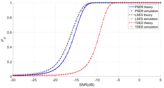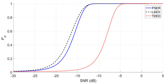 Under the same conditions, the PSER will compare the detection probability with the commonly used time-domain energy detection (TDED) [29] and local spectral energy detection (LSED) methods to evaluate the detection performance of the PSER.