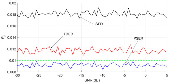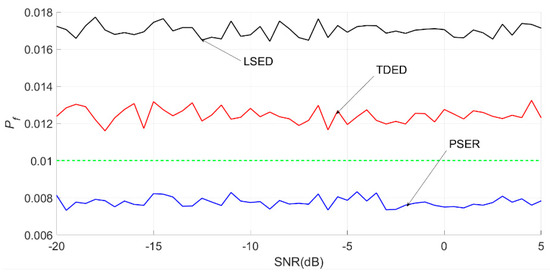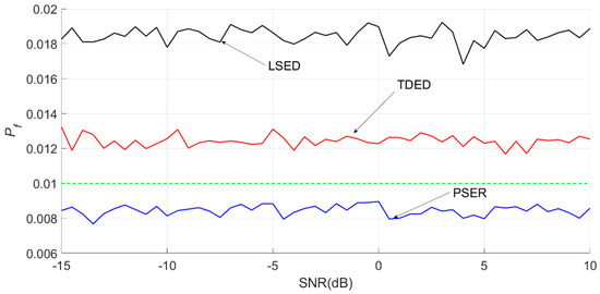 False alarm probabilities of the PSER, LSED, and TDED, where the sub-band was 66–105 Hz, N was 1024, and Pf was 0.05.