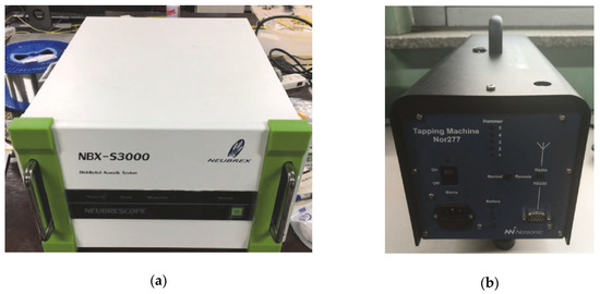 The vibration signals were collected by an NBX-S3000 instrument (Nebrex Co., Hyogo, Japan). The vibration signals were generated by a tapping machine, which is a standard piece of vibratory equipment. There were five percussion hammers on the tapping machine, and the tapping interval was 0.1 s. Photographs of the NBX-S3000 instrument and tapping machine are shown in Figure 18.
