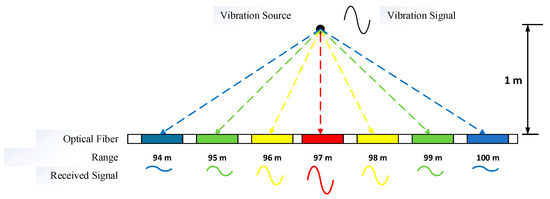 The state of one fiber with one vibration source is shown in Figure 19. According to the vibration attenuation law, the vertical intersection point between the vibration source and optical fiber is the strongest point of vibration.