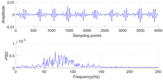 The recording time of the tapping signal was 10 s, and the tapping interval was 0.1 s; therefore, 100 tapping samples were taken at one distance. The time-domain waveform and PSD of the tapping signal at 97 and 85 m are shown in Figure 22 and Figure 23, respectively.