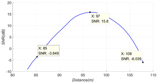 The approximate SNRs from 84 m to 108 m are shown in Figure 24. The signal at 97 m was closest to the vibration source, so it had a high SNR. The signal at 85 m or 108 m was far from the vibration source, so it had a low SNR.