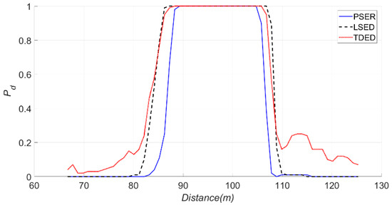 Detection probabilities of the PSER, LSED, and TDED, where the sub-band was 66–105 Hz, N was 1024, and Pf was 0.05.