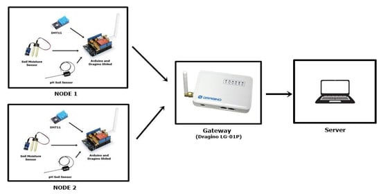 The design of the Internet of Things (IoT) based on LoRa communications is depicted in Figure 1. The sensor node is equipped by the LoRa transmitter to send the information of sensing measurement. From the sensor node, sensing data is transmitted to the LoRa gateway using half-duplex communication. Therefore, data is acquired by the server, acting as the cloud of our scheme. Eventually, users can monitor the environment of their field and use the record of the data to have an action based on the reality of the field.