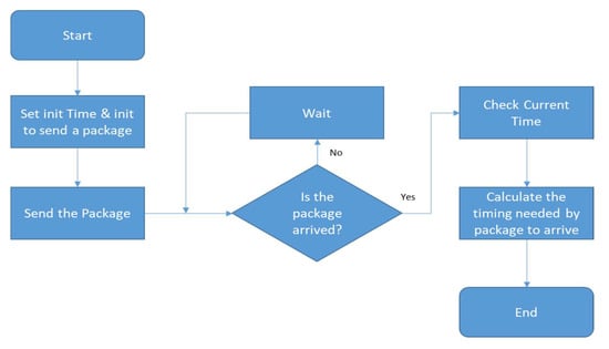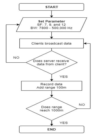 In this scenario, we verify that the maximum distance and packet delay of the LoRa-based Dragino implementation in agriculture can be reached. The test is conducted by varying the spreading factor and the bandwidth. First, the spreading factor is varied from 7, 9, and 12. Moreover, the bandwidth is set in values of the range of 7800–500,000 Hz. The delay as well as the maximum data are measured to have an insight into the data communication from the client side to the server. The location of clients is spread out in the range of 50–1000 m with an increment of 100 m. Figure 4 shows the test flowchart of LoRa-based Dragino implementation. For the delay test, we take the average value of the delay at each location that is passed for 1 min. The delay measurement was implemented in the Microcontroller used by device nodes. The scheme for calculation is depicted in Figure 5. Please note that the spreading factor is set firstly, then followed by the bandwidth value. This is required to identify the sufficient bandwidth value so that the data is transmitted at the closest distance to the server.