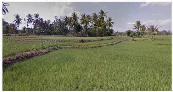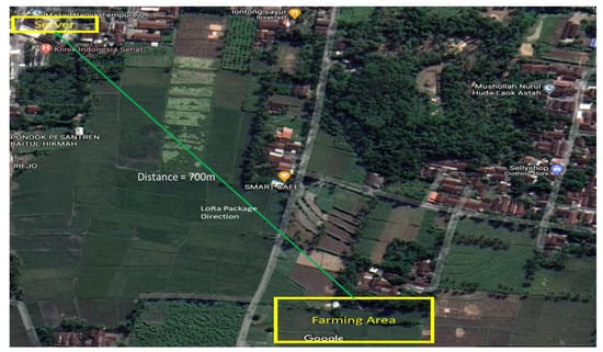 We had established and set the real environment of the LoRa-based Dragino implementation in rural areas, more specifically, on one of authors’ farming areas, as illustrated in Figure 6. The surroundings of the farming site used to conduct the experiment is depicted in Figure 7. The map was taken from Google Maps, and the implementation was located in Tempurejo village, Jember, Indonesia. We also conducted assessments for evaluating the performance of the default parameter from Dragino and measuring available variables affecting LoRa performance, such as spreading factors and bandwidth. Gateway was located near the server, and the distance between the gateway and the farming site was around 700 m. We adjusted the distance of measurement between device nodes and gateway based on the straight line shown in Figure 7 and used in the architecture of the communication protocol as shown in Figure 3.