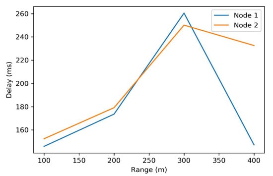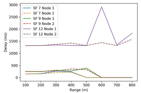 Firstly, the test was conducted to assess the default parameters from Dragino comprising the spreading factor of 7 and the bandwidth of 125 kHz. The parameter was carried out following the existing scenario explained in Section 3. Table 1 and Figure 8 show the detailed result of the experiment. As can be seen in Table 1, the average delay of the proposed scheme was around 145–260 ms. The experiment to get the real behavior of the available default parameters from Dragino was set to get the real data from a distance of 100 m to 400 m as a maximum distance. We also noticed that, the further the distance between the server and the client, the delay may increase, indicated by the data taken in the range between 100 to 300 m. However, an anomaly came in the data received from range 400 m. We further investigated that it may come from the shaking device caused by natural effects, such as wind or an animal passing through our device nodes in a real environment. This phenomenon, experiencing of the shaking device, may also affect the wiring connection, and then the LoRa module cannot smoothly process the data sending. A further experiment is necessary to support our findings.