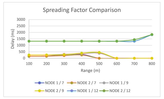 Besides that, by looking at the facts contained in Table 3, several findings could be summarized. First, to be able to transmit data at a close range, the spreading factor parameters need to be decreased. Meanwhile, if the user prefers to transmit data over long distances, the value of the spreading factor must be increased. Second, adjusting the value of the spreading factor to receive data transmission with a specific range is significantly affecting the delay generated by the system. Thus, the further the data is transmitted, the spreading factor value needs to be increased. Assessing the value of the spreading factor, it is clearly presented in Table 3 that adjustment of the spreading factor to the higher value was impacting the delay communication in the proposed work, even at very close distances (100 m). Meanwhile, the clear illustration of the relationship between the value of the spreading factor to the distance and delay is depicted in Figure 9. From the graph shown in Figure 9, it could be notably seen that the delay measured in our real implementation was assessed to have the rising trend indicated by the increasing of the time measured during the data transmission. However, the anomaly was found in the data taking from NODE 1. As can be seen in Table 3, NODE 1 experienced the data deviation for the communication taken from the distance of 600 m. We found that the nature effects played an essential role for the deployment of LoRa in agriculture. The experience of the device shaking, caused by nature such as wind or rain, would have an impact for the communication in the real world. We also conducted the experiment for 900 m and 1000 m. However, in our proposed work implementation, the device node could not reach the gateway.