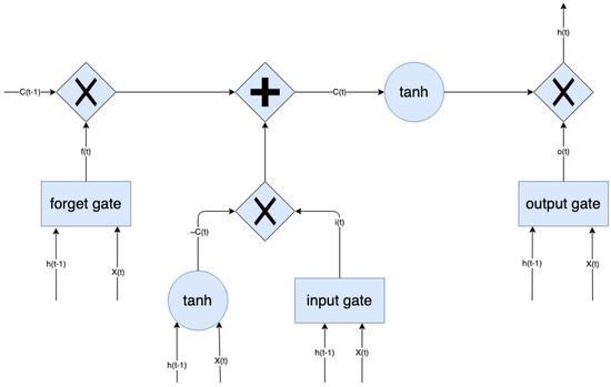 where , , , are the arrays of weights that connect to the three gates and the cell entrance, , , , are the weight matrices that connect to the three gates and the cell entrance, , , , are the bias terms of the three gates and the cell entry, represents the function , and represents the hyperbolic tangent function . Secondly, the output state of the cell is calculated: