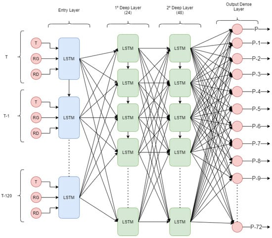 The most relevant features were those linked to diffuse radiation (RD), global radiation (RG), and temperature (T). These three features were selected as inputs to the neural network, as shown in Figure 2, with the aim of extracting the output window with the output power prediction for the PV panel.