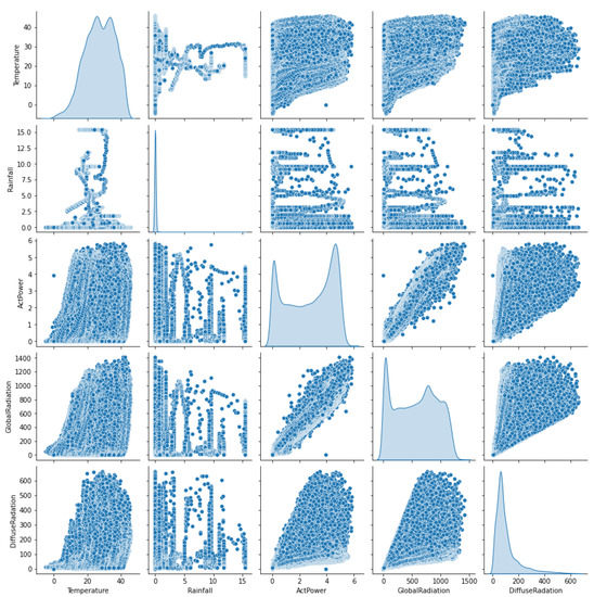 The correlation between the 12 features in the data set is analyzed, shown in Figure 3, with the aim of discarding those that do not contribute knowledge to the model. The main focus was to obtain the output power. It is true that, if the algorithm were to detect clouds, it would make more sense to predict the solar incidence, or, if the model were applied to wind energy, it would have more value than the radiation index. The variable “active energy delivered-received” has been discarded as it represents the energy status of the entire solar station. In the case study, the focus is on a specific station, not on all the solar plants in the park. On the other hand, the variable “Current Phase Average” is the output variable of the panel but is measured in amperes. In future research, it can be taken into account, however not as an input for the model, as it does not provide information. As the variable “Performance Ratio” represents the area of the active board, but does not have knowledge of the relationship between the module arrays, it could not be applied to detect malfunctioning in parts; rather, the overall evaluation of the board as a whole has been chosen. The solar station is located in a warm climate, with no precipitation and no wind, so the variables associated with these phenomena do not provide any knowledge to this particular model (“Wind speed”, “Wind Direction”, “Weather Relative Humidity”, and “Rainfall”). It is proposed to incorporate these variables from data sets created in other geographical points. This would improve the model further.