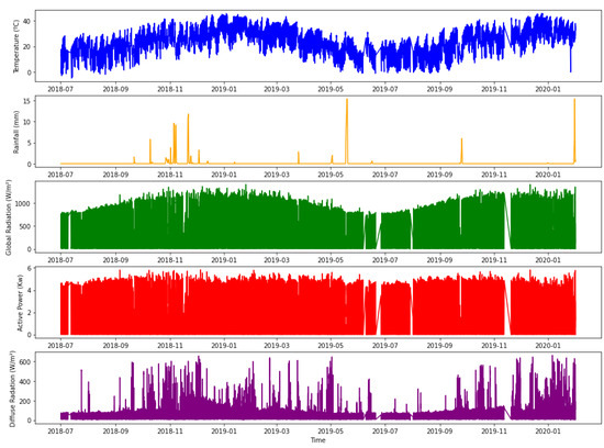 In Figure 4, it is possible to see a representation of the data processed over time. In addition, it can be observed how the radiation values are similar to the power output of the panel, so it was considered that they have a high correlation and can be used by the model. Moreover, the variable that represents the precipitation was eliminated because it does not provide value to the model. The station is located in Australia, so it has a very hot climate and most of its territory is a desert. If the location of the plant had a different climate, the importance of rainfall in the model could be evaluated.