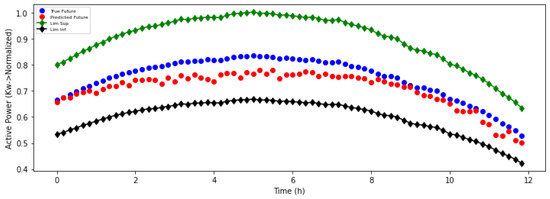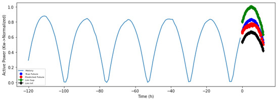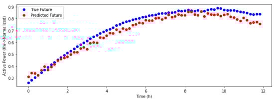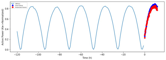 Figure 5 and Figure 6 show in blue the input window representing the active power of the panel and the resulting output in red. An approach was designed in which a time window was introduced that was composed of a five-day history of measurements and a forecast for the next day. As a result, the output power of the solar panel has been obtained. These results were compared with the real value provided by the data set.