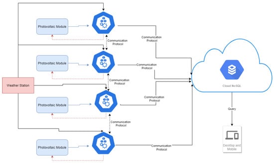 The idea is based on each PV module being associated with an edge node where system operations are performed. The answer would be unique for the associated module and thus save communication costs and latency. Apart from obtaining the data from the board, the node receives the meteorological data from the area in order to make the prediction. The communication data flow would be done through Message Queue Telemetry Transport (MQTT) or similar communications. These communications would be programmed every certain period of time with the cloud to store all the events that take place. The cloud would be in charge of managing all the operations performed by the architecture, apart from recording all plant activity. In addition, a service-based platform would be developed where the entire station could be monitored in real time. This platform would show the predictions that would be made in the nodes. These nodes would in turn manage a series of actuators that control the current flow of the solar panels in case the network has a critical failure. Figure 9 gives an outline of the proposal.